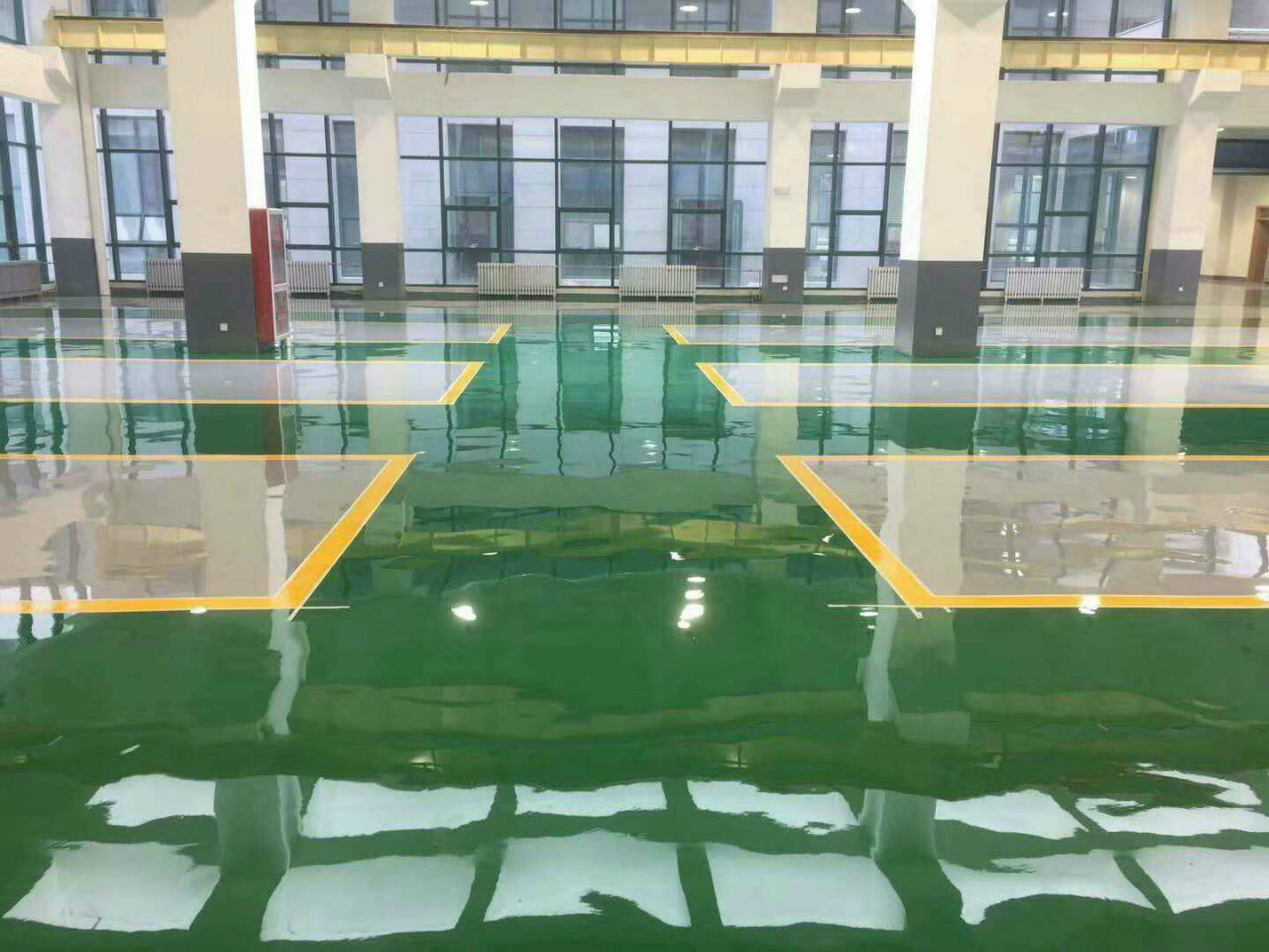 ⑤環(huán)氧面漆:用鏝刀鏝刮自流平面涂層,完工后整體表面光亮潔凈,顏色均一,可增加一道罩光金油,以延長使用年限;